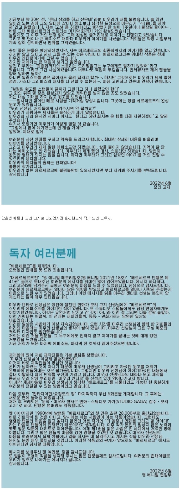 동의하지 않는 분들도 있겠지만 저는 베르세르크는 시작부터 그 끝이 정해져있는 작품이라고 생각해왔습니다. 그덕에 끝이 나오지 않으면 범작 일뿐입니다. 미우라 선생 사후 차마 위의 이야기를 여기든 어디든 적기 그러했지만 그 끝이 나오게 될것으로 생각되어 명작으로 마무리 되기를 기원합니다.